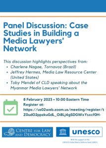 You are invited to a Panel Discussion: Case Studies in Building a Media Lawyers’ Network on 8 February 2023 at 10:00 AM EST. This panel discussion highlights the experiences of lawyers in three countries in forming a network of media lawyers. It will be moderated by Laura Notess, Senior Legal Officer at CLD, and will feature: